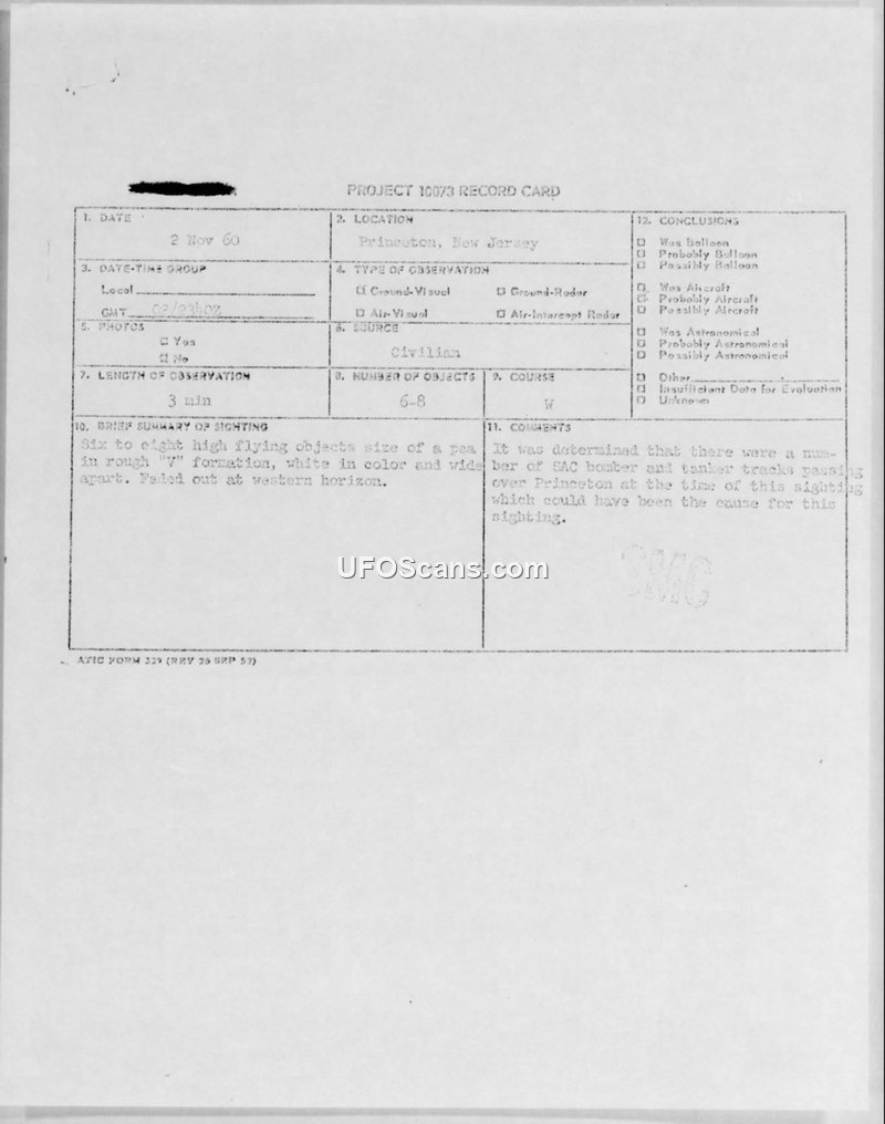 This document details a UFO sighting report filed under Project 10073, occurring on November 2, 1960, in Princeton, New Jersey. A civilian witness reported observing six to eight high-flying, white, pea-sized objects moving in a rough V-formation from East to West. The observation lasted approximately three minutes before the objects faded out at the western horizon. The witness, an employee of the Roebling Corporation, was deemed to be of good reliability. The investigation, conducted by Captain William S. Barnett of the New York Air Defense Sector, involved coordinating with the New York Air Movements Information Section to identify potential air traffic in the area. The investigation concluded that the sighting was likely caused by Strategic Air Command (SAC) bomber and tanker tracks. These aircraft were participating in a coordinated exercise between SAC and the Air Defense Command (ADC) known as 'Top Team,' which was active on November 2 and 3, 1960. The report notes that there was excellent correlation between the SAC flight paths and the reported sighting, leading the authorities to consider the case closed.