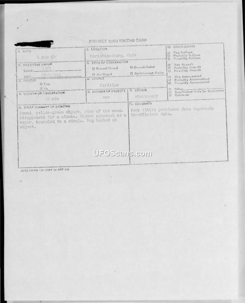 Project 10073 Record Card — Christiansburg, Ohio, 4 Nov 60