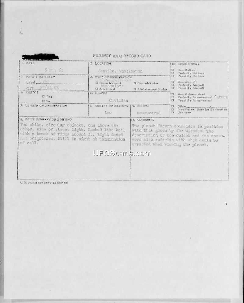A civilian reported two circular, ringed objects in the sky over Seattle on November 6, 1960. ATIC investigators concluded the sighting was an observation of the planet Saturn.