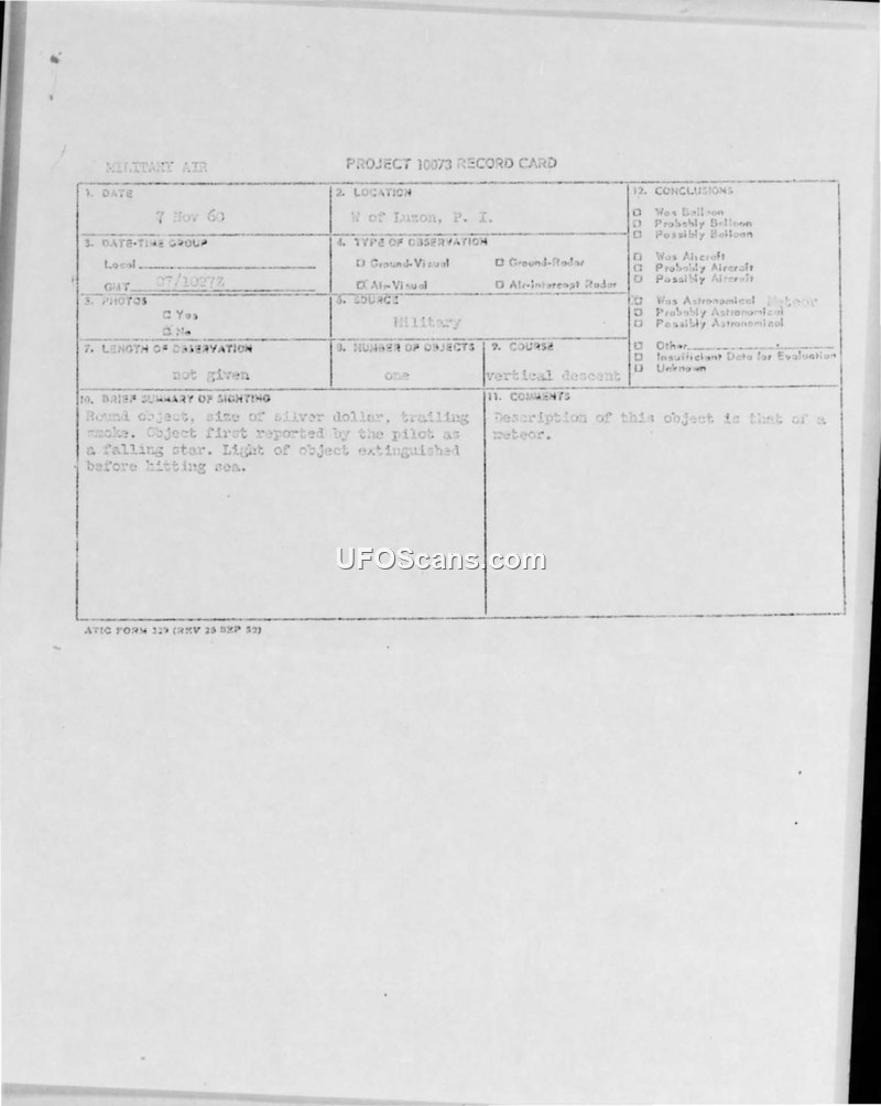 A pilot reported a round, smoke-trailing object in vertical descent near Luzon on November 7, 1960. ATIC officially concluded the object was a meteor.