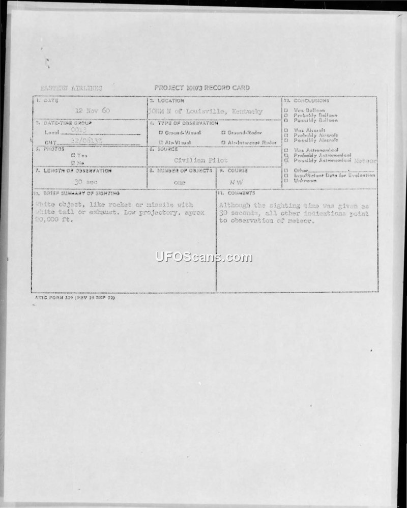 On November 12, 1960, at 0013 GMT, an Eastern Airlines pilot reported a sighting while flying north of the Nabb Omni Range, approximately 50 nautical miles north of Louisville, Kentucky. The pilot, operating a standard Constellation aircraft at 9,000 feet with a heading of 350 degrees, observed a white object that appeared to be a rocket or missile. The object was described as having a white tail or exhaust and was moving on a low trajectory at an estimated altitude of 20,000 feet. The observation lasted for approximately 30 seconds. The weather conditions were reported as clear. The incident was formally documented under Project 10073. Following the report, the Air Technical Intelligence Center (ATIC) evaluated the sighting. Despite the pilot's detailed description of a rocket-like object, the official conclusion reached by the evaluating authorities was that the sighting was likely an observation of a meteor. The report notes that while the duration of 30 seconds was recorded, other indicators led to the meteor classification. The documentation includes a teletype report sent from the Detroit Air Defense Sector, which confirms the details provided by the pilot and notes that the Indianapolis Air Route Traffic Control Center (ARTCC) had no additional comments regarding the event.