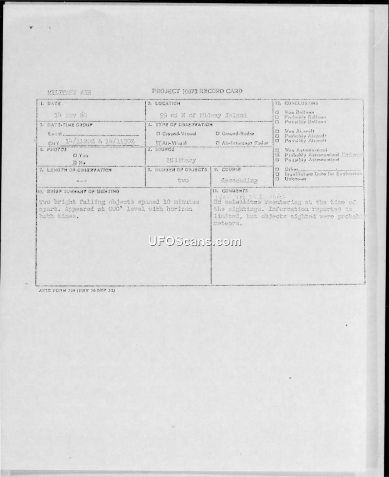 A WV-2 aircraft reported two bright, falling objects near Midway Island on November 14, 1960. ATIC concluded the objects were likely meteors.
