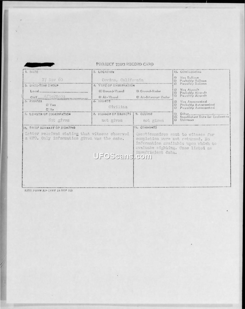 Project 10073 Record Card — Covina, California, 17 Nov 60
