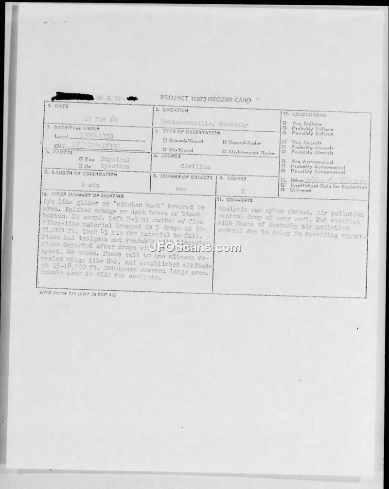 On November 17, 1960, between 1300 and 1330 hours, witnesses in Hendersonville, Kentucky, observed an unidentified aerial object for approximately two minutes. The object was described as resembling a glider or a 'chicken hawk,' colored orange, dark brown, or black, and possessing wings similar to a U-2 aircraft. The witnesses reported that the object hovered at an altitude of 15,000 to 18,000 feet and emitted no sound. During the observation, the object dropped a fine, fiber-like material that took approximately 45 minutes to fall to the ground, covering a large area. The object subsequently departed at a 'tremendous speed.' The witnesses attempted to identify the object using binoculars but could not discern any insignia. Following the incident, a sample of the dropped material was collected and sent to the Aerospace Technical Intelligence Center (ATIC) for analysis. On November 23, 1960, the material was provided to a Mr. Naugle for examination. The subsequent analysis identified the substance as nylon thread. The official conclusion reached by the investigating agency was that the event was likely an air pollution control drop of some nature, although this could not be definitively verified with the State of Kentucky air pollution control authorities due to delays in the reporting process. The document includes a Project 10073 record card, internal correspondence from the Aerospace Technical Intelligence Center at Wright-Patterson Air Force Base, and notes regarding the material analysis.