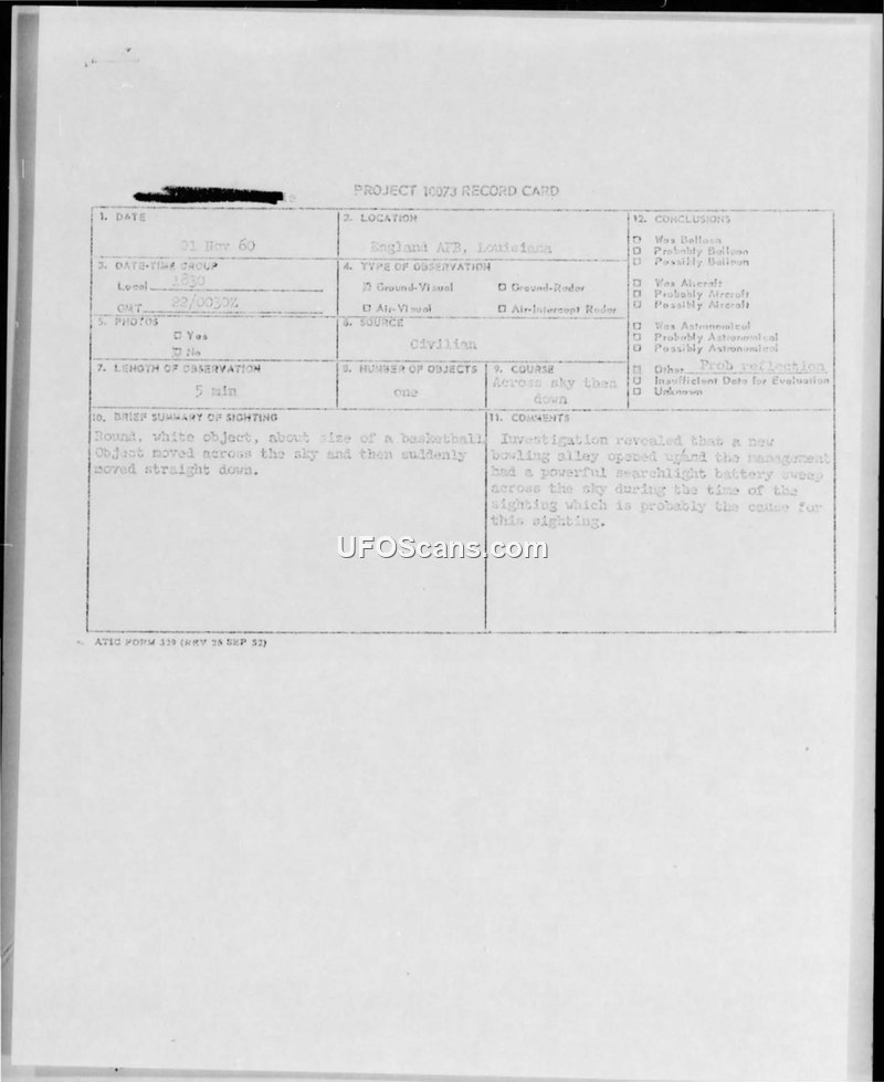 A 1960 sighting of a round, white object near England AFB was investigated by the USAF. The phenomenon was officially attributed to searchlight reflections from a local bowling alley.