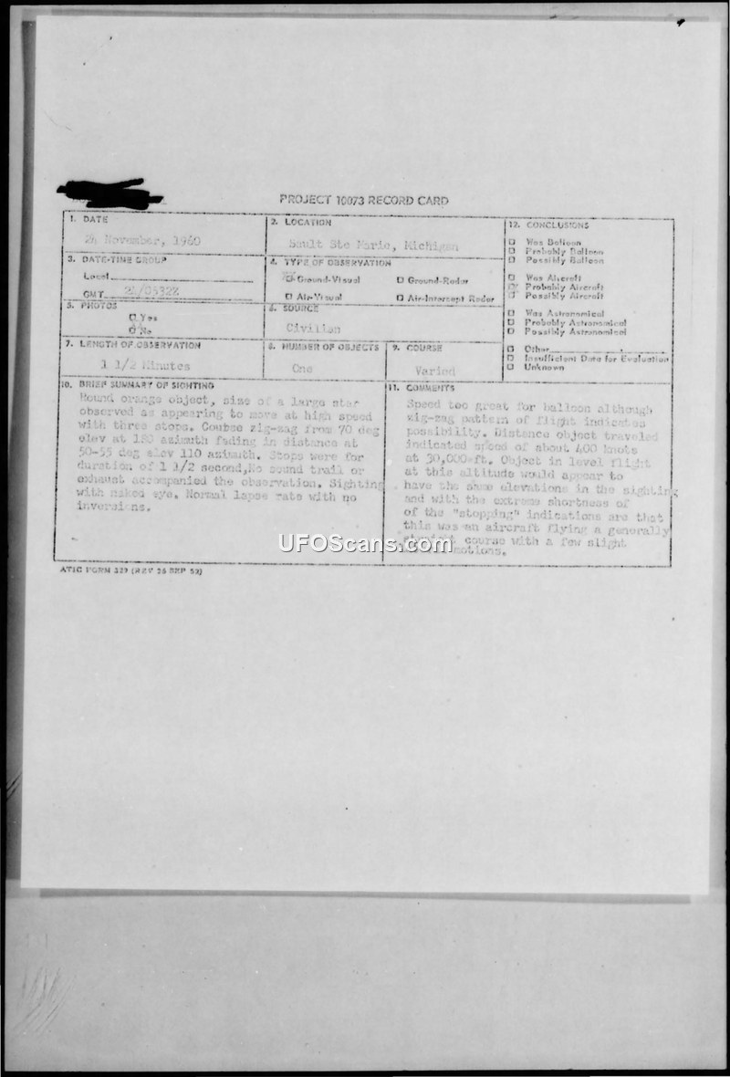 Project 10073 Record Card — Sault Ste Marie, Michigan, 24 November 1960