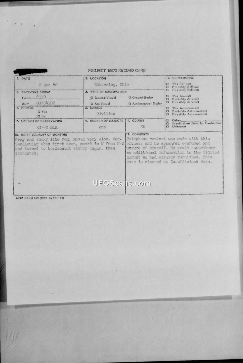 Project 10073 Record Card — Kettering, Ohio, 2 December 1960