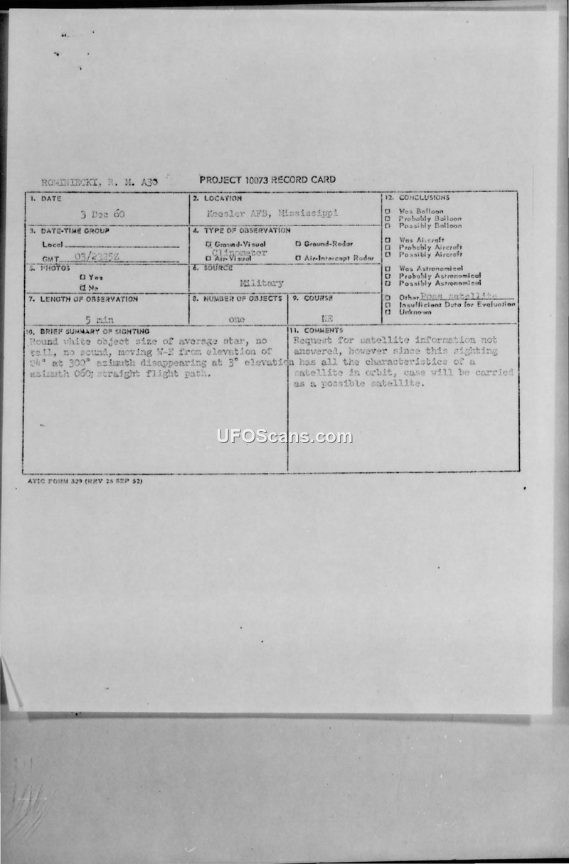 On December 3, 1960, at 2325Z, Airman Third Class Richard M. Rominiecki, a weather observer with Detachment 6 of the 8th Weather Group at Keesler Air Force Base, Mississippi, observed an unidentified aerial phenomenon. The witness, noted for his reliability, reported seeing a single, round, white object that appeared to be the size of an average star. The object exhibited a steady light with no twinkle and produced no sound. It followed a straight flight path from west to east, moving from an elevation of 24 degrees at 300 degrees azimuth, eventually disappearing at 3 degrees elevation and 060 degrees azimuth. The total duration of the observation was approximately five minutes. The witness used a clinometer (ML-119) solely to obtain angle readings and observed the object with the naked eye. Weather conditions at the time were favorable, with unlimited ceiling, 10-mile visibility, and only scattered high cirrus clouds. The temperature was in the high fifties, and winds were light. Following the initial report, the Air Technical Intelligence Center (ATIC) requested further details regarding the object's shape, color, and flight path. In a follow-up memorandum dated December 30, 1960, Major William R. White confirmed the details of the sighting and provided the requested meteorological data, including the temperature lapse rate, which showed a strong subsidence inversion. Although a formal request for satellite tracking information was made, the response was not received. Consequently, based on the object's steady light, lack of scintillation, and consistent flight path, the incident was officially classified as a possible satellite in orbit. The documentation includes the original Project 10073 record card, internal Air Force message traffic, and the final report from the base commander.