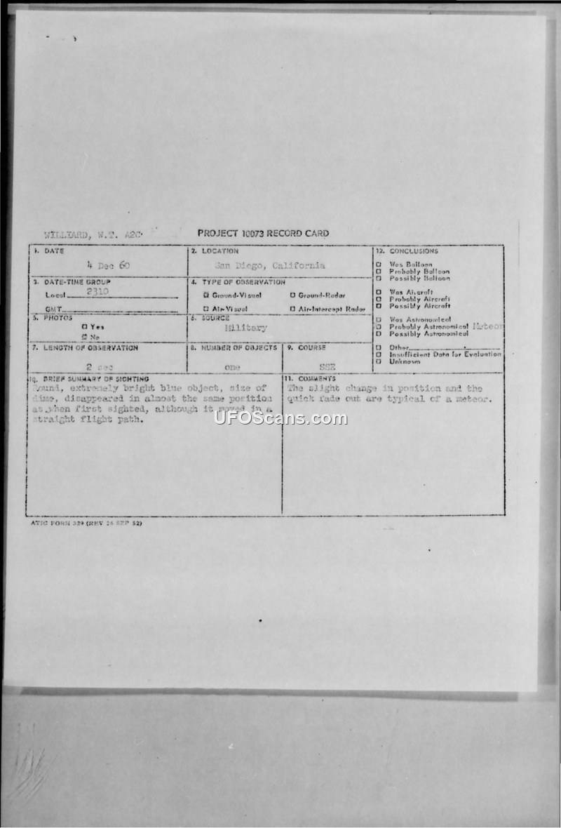 A sighting report from December 1960 involving an Airman who observed a bright blue, round object in San Diego. The event was officially attributed to a meteor.