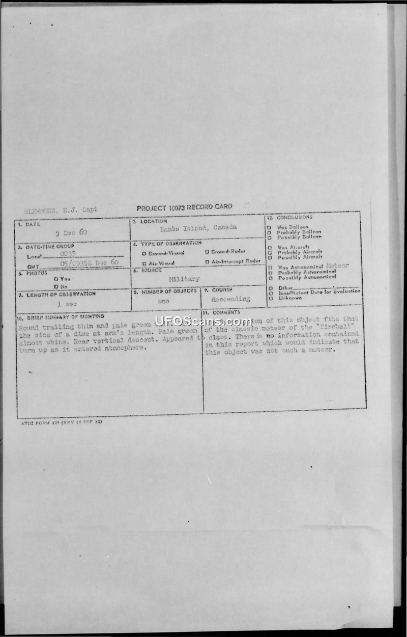 A 1960 USAF sighting report from a weather reconnaissance flight over Canada describes a fireball-like object. The military concluded the object was a meteor, noting it was likely not the re-entering Sputnik VI satellite as initially suspected.