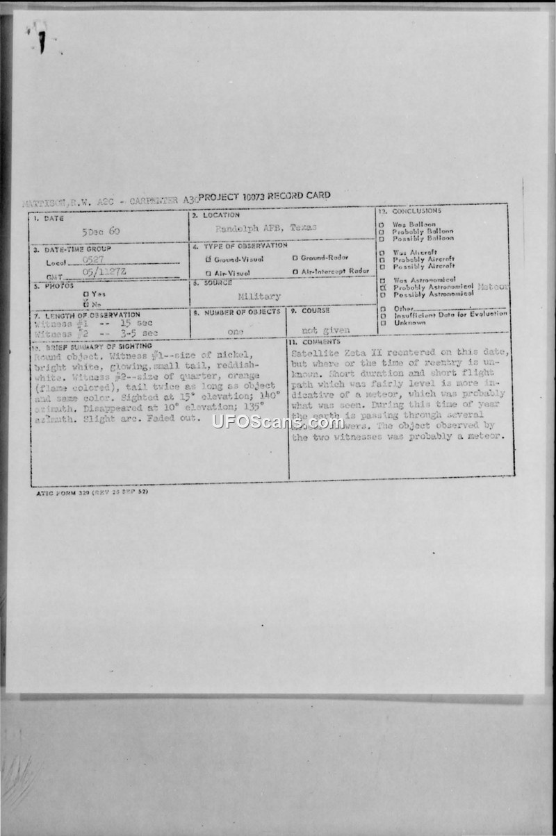 Two airmen at Randolph AFB reported a glowing, tailed object on 5 December 1960. Official investigation concluded the object was likely a meteor or potentially a satellite reentry.