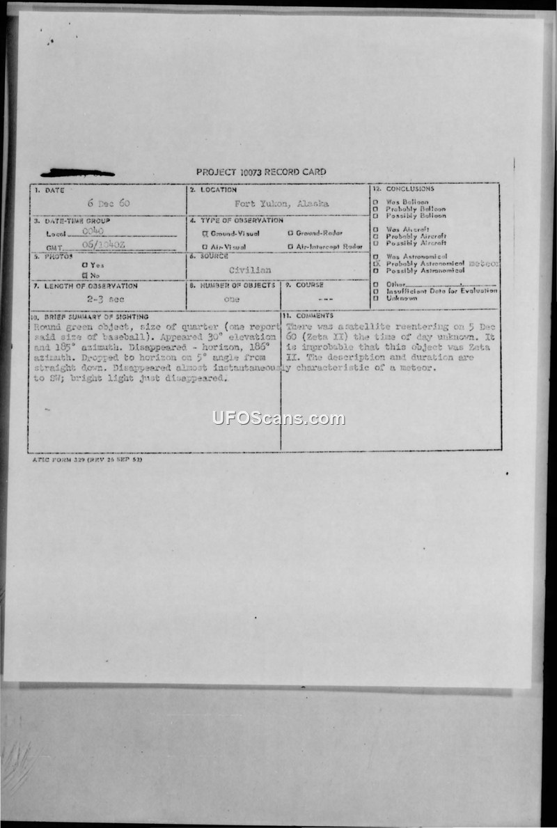 A civilian in Fort Yukon, Alaska, reported a brief, 2-3 second sighting of a round, green-edged object on December 5, 1960. Military intelligence evaluated the report and concluded the object was likely a meteor rather than the Zeta II satellite reentering the atmosphere.