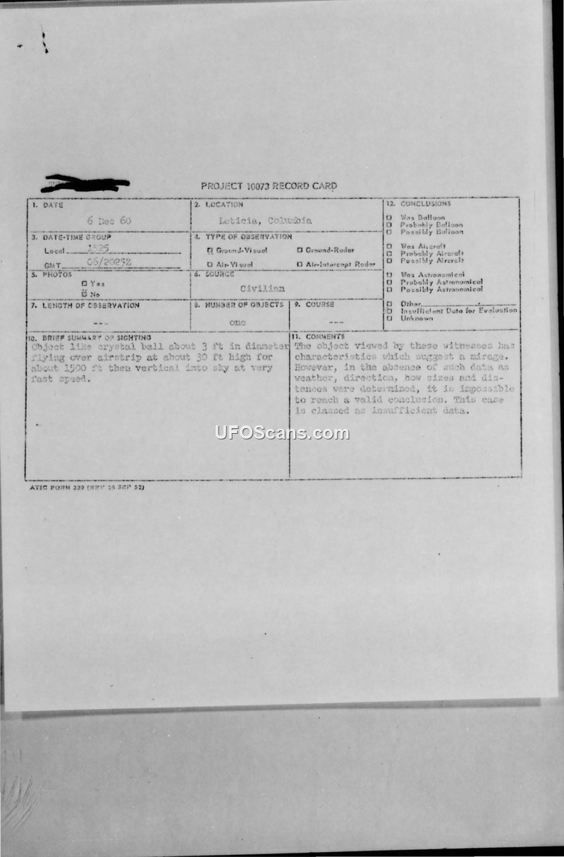 A 1960 sighting in Leticia, Colombia, of a 'crystal ball' object was reported to Project 10073. ATIC investigators classified the case as having insufficient data, noting that while a mirage was a possibility, the lack of supporting evidence prevented a definitive conclusion.