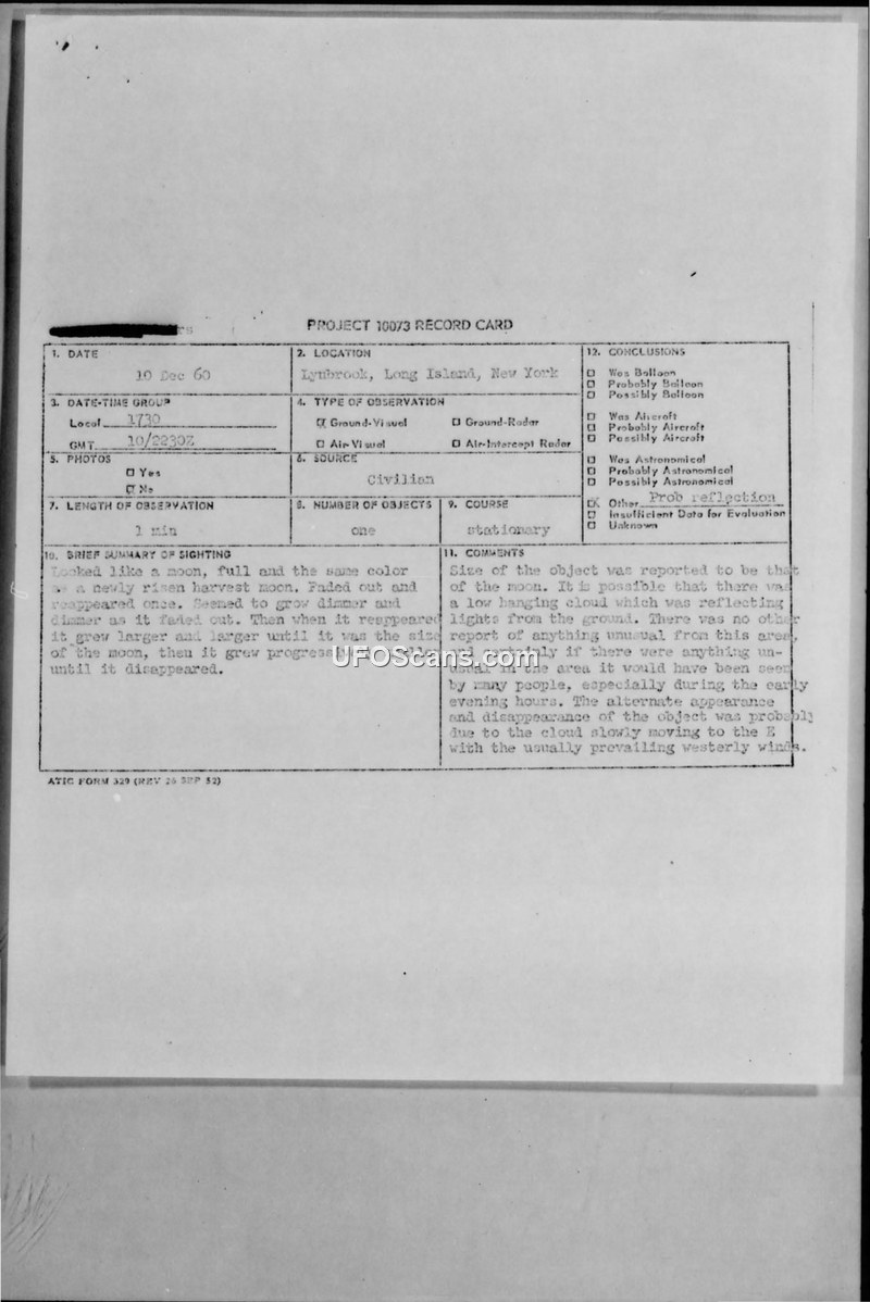 Project 10073 Record Card — Lynbrook, New York, 10 December 1960