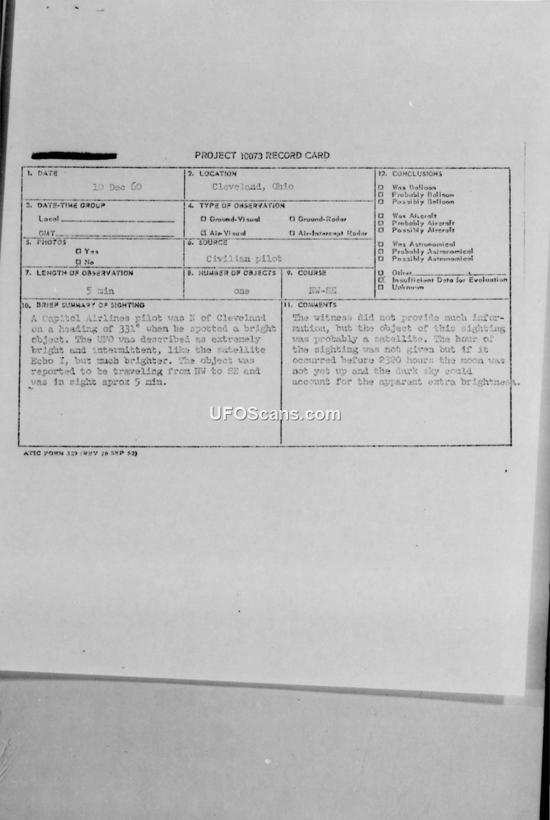 Project 10073 Record Card — Sighting Report, Cleveland, Ohio, 10 December 1960