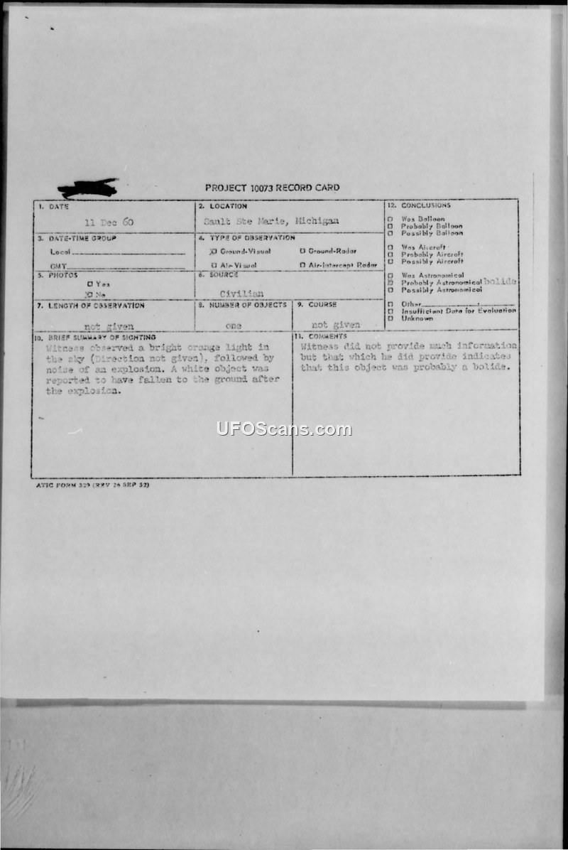 Project 10073 Record Card — Sault Ste Marie, Michigan, 11 Dec 60