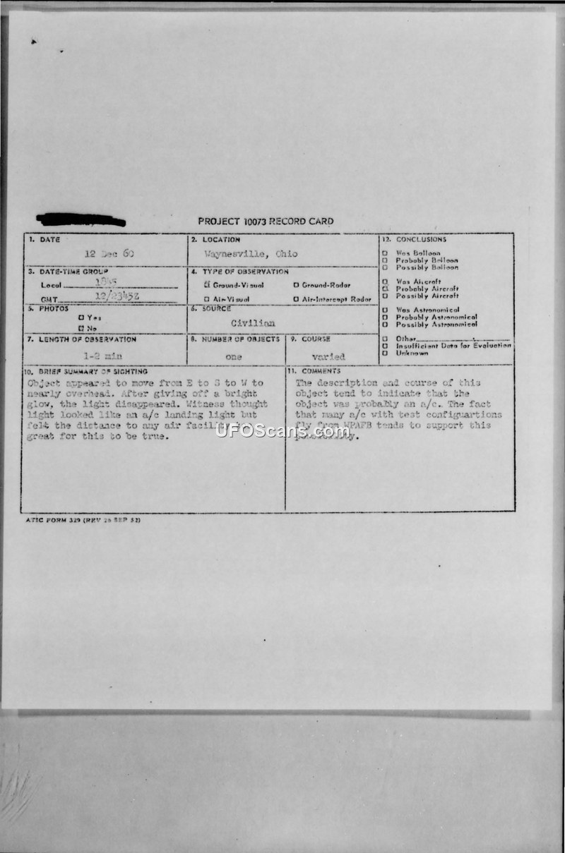 Project 10073 Record Card — Waynesville, Ohio, 12 Dec 60