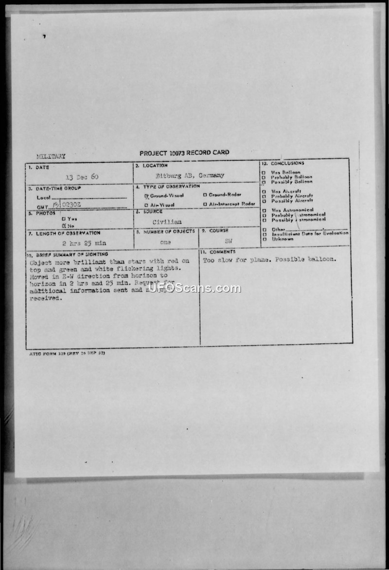 Project 10073 Record Card — Bitburg AB, Germany, 13 Dec 60