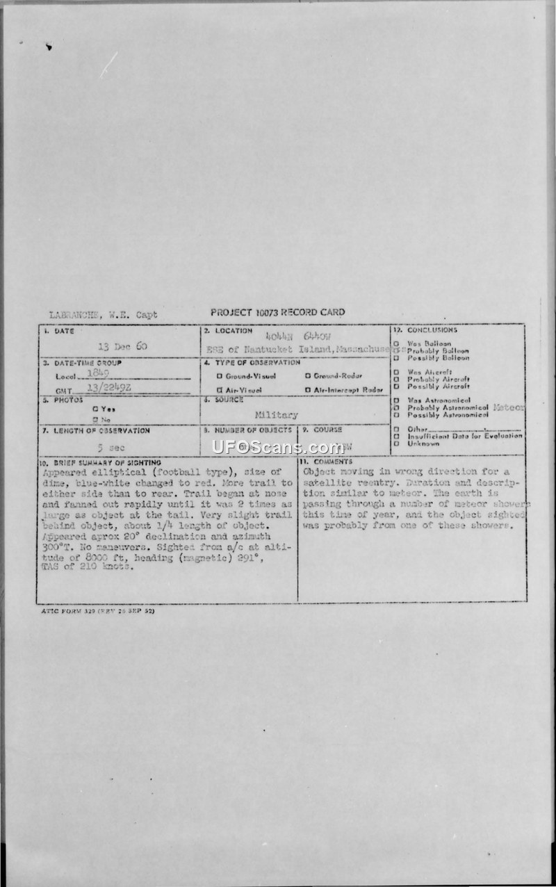 On December 13, 1960, at 1849 GMT, Captain William E. Labranche of the 551st AEW&CON Wing reported an unidentified aerial phenomenon while piloting an RC-121D aircraft. The sighting occurred at an altitude of 8,000 feet, located ESE of Nantucket Island, Massachusetts (4044N 6440W). The witness described the object as elliptical, resembling a football, and approximately the size of a dime. Initially appearing blue-white, the object turned bright red upon disappearance. A notable feature was a trail that began at the nose and fanned out rapidly, reaching twice the size of the object at the tail, with an additional slight trail behind the object measuring about one-quarter of its length. The object was observed for approximately five seconds, traveling in a WSW direction at a true airspeed of 210 knots. The pilot noted that the object performed no maneuvers and was observed descending behind a deck of stratus clouds. Weather conditions at the time included an undercast 500 feet below the aircraft. Captain Keith H. Morehouse, the Wing Intelligence Officer, processed the report. The official conclusion reached by the Air Technical Intelligence Center (ATIC) was that the object was likely an astronomical meteor. This assessment was based on the object's duration and description, as well as the fact that the Earth was passing through meteor showers during that period, which the investigators deemed a more plausible explanation than satellite reentry given the object's trajectory. No physical evidence, photographs, or radar contacts were associated with the incident.