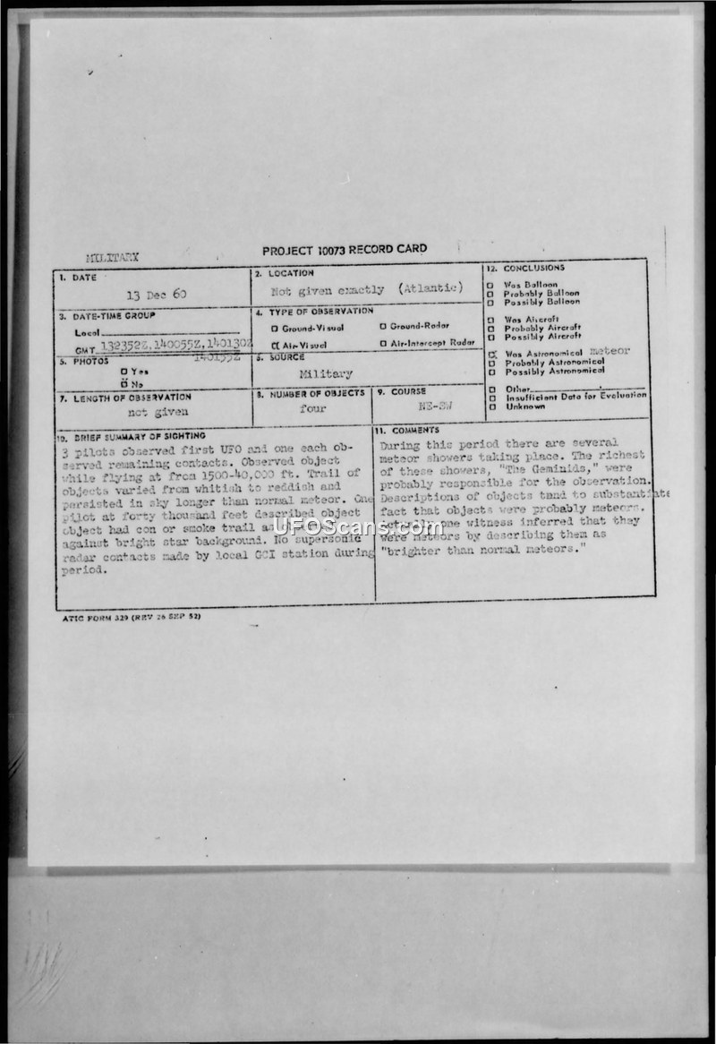 Military pilots reported four unidentified objects over the Atlantic on December 13, 1960. ATIC concluded the sightings were likely caused by the Geminid meteor shower.