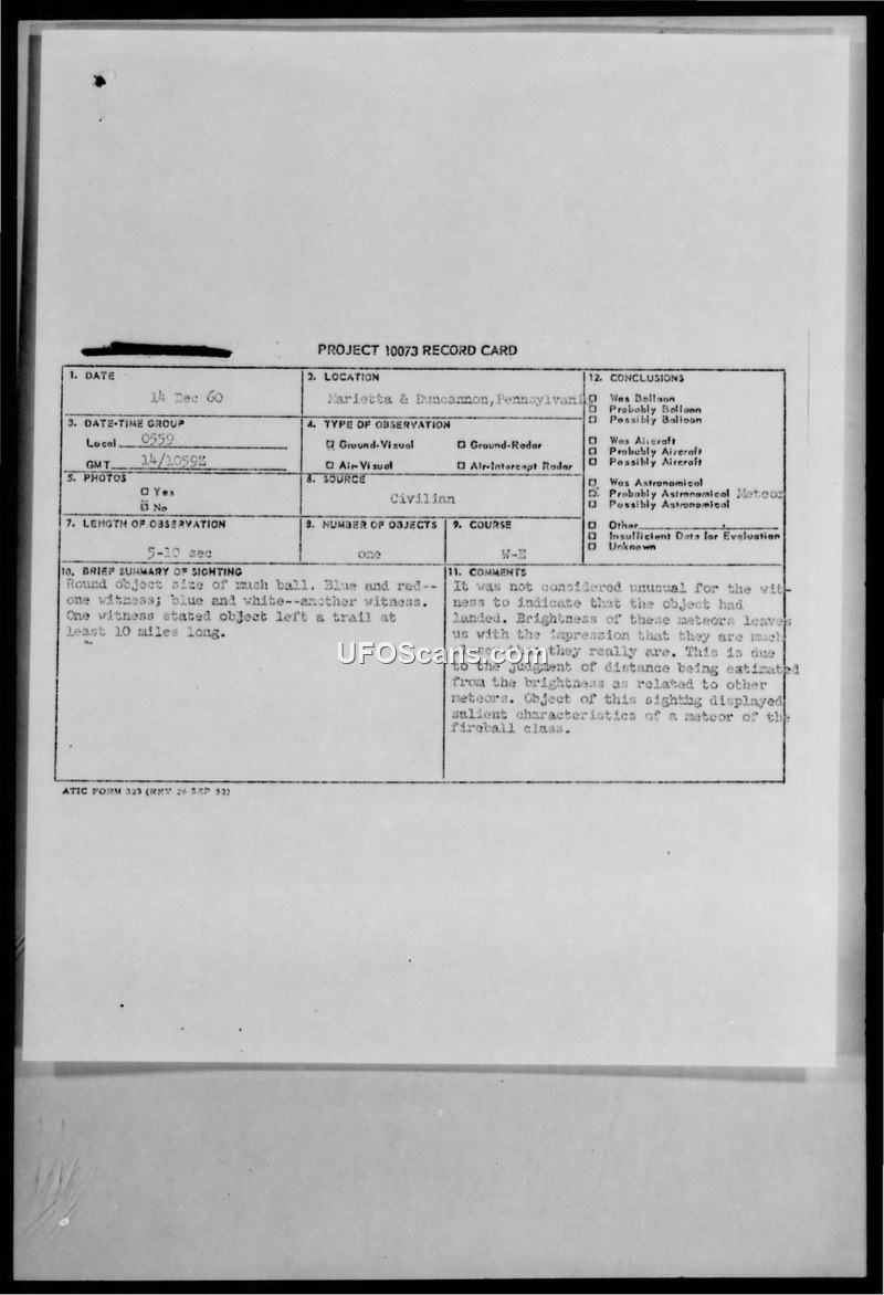 A sighting of a bright, trail-leaving object on December 14, 1960, was reported by multiple witnesses in Pennsylvania and Connecticut. The Air Technical Intelligence Center concluded the object was a meteor.