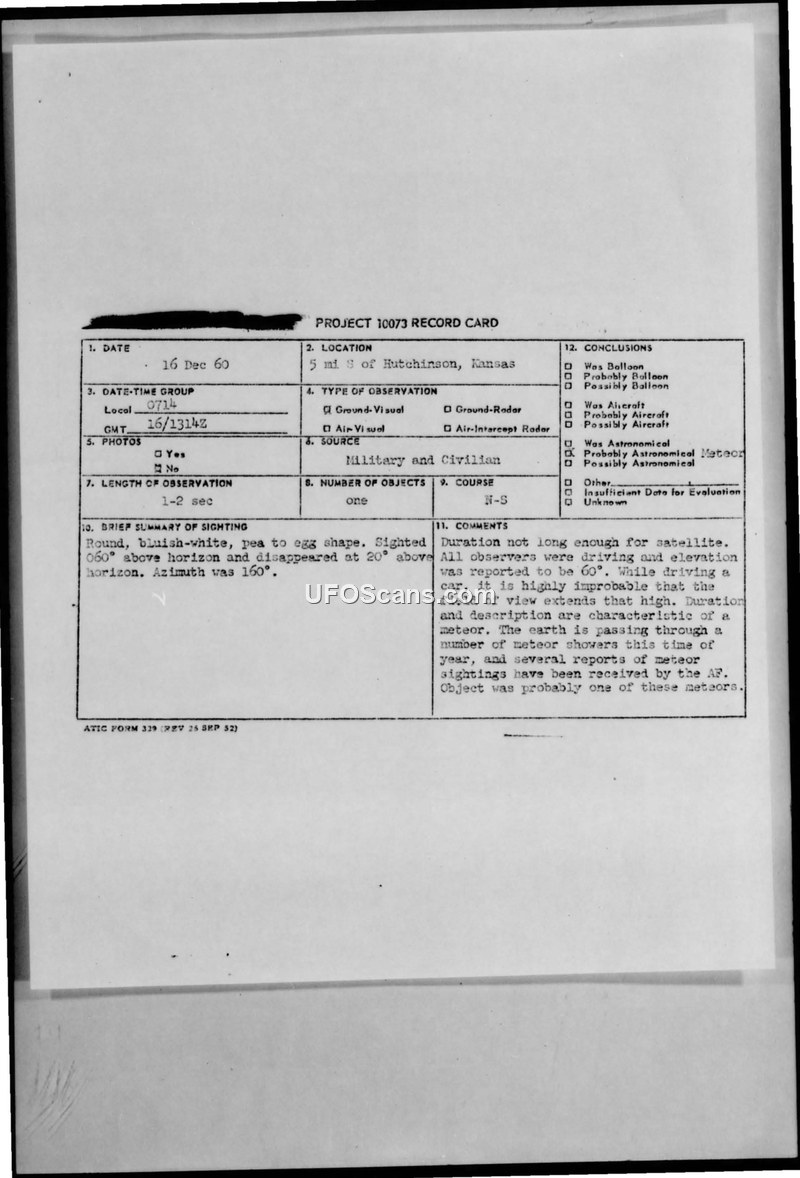 Three witnesses in separate vehicles reported a brief, bluish-white aerial object near Hutchinson, Kansas, on December 16, 1960. The Air Technical Intelligence Center concluded the object was likely a meteor.