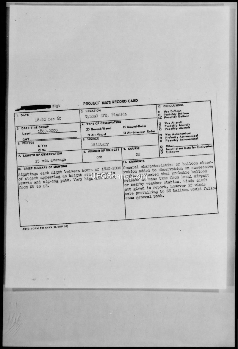 A series of UFO sightings at Tyndall AFB in December 1960 were reported by a Master Sergeant and subsequently investigated by the Director of Operations. The official conclusion attributed the sightings to a balloon.
