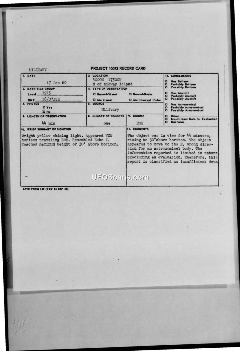 A report of a bright yellow light observed for 44 minutes near Midway Island on December 17, 1960. The sighting was classified as having insufficient data for evaluation by ATIC.
