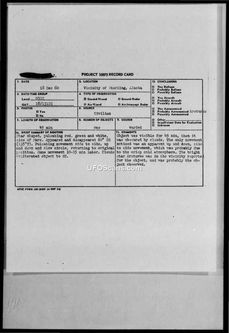This document is a Project 10073 record card and associated teletype report concerning a UFO sighting that occurred on December 18, 1960, in the vicinity of Sterling, Alaska. The witnesses, a furnace repairman from Ft. Richardson and his wife, reported observing a star-shaped object for approximately 45 minutes. They described the object as having the size of Mars and pulsating with red, green, and white colors. The witnesses reported that the object performed movements including side-to-side, up-and-down, and slow circular motions before returning to its original position. The observation was eventually obscured by clouds. The report includes detailed weather data and coordinates for the sighting. Captain William T. Wilson, an Intelligence Officer with the USAF, evaluated the report. He concluded that the object was likely the star Arcturus, noting that the star was in the reported vicinity and that the perceived pulsating movements were likely an atmospheric effect caused by the cold, clear conditions at the time of the observation. The report explicitly notes that a weather balloon released from Anchorage International would not have been in the area of the sighting and that there was no known air traffic in the vicinity.