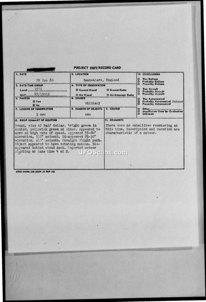 Project 10073 Record Card: Sighting at Bentwaters, England, 22 Dec 60