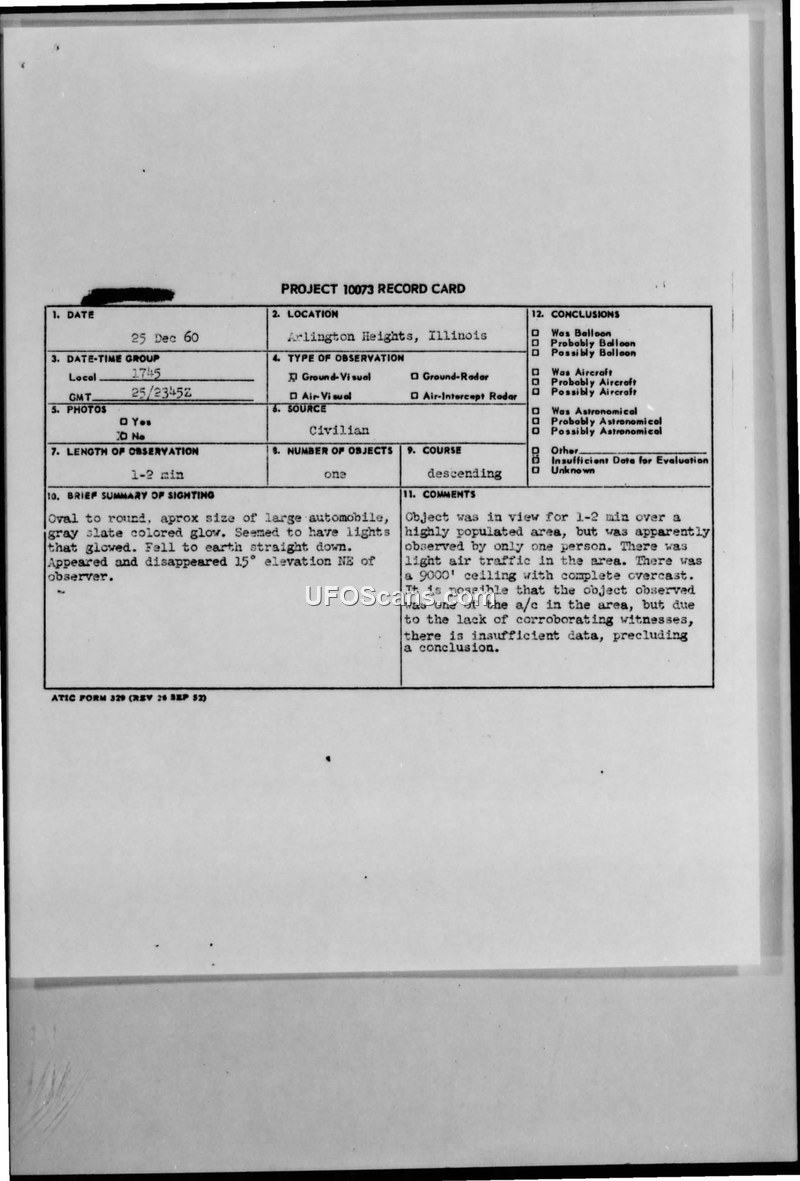 Project 10073 Record Card — Arlington Heights, Illinois, 25 Dec 60