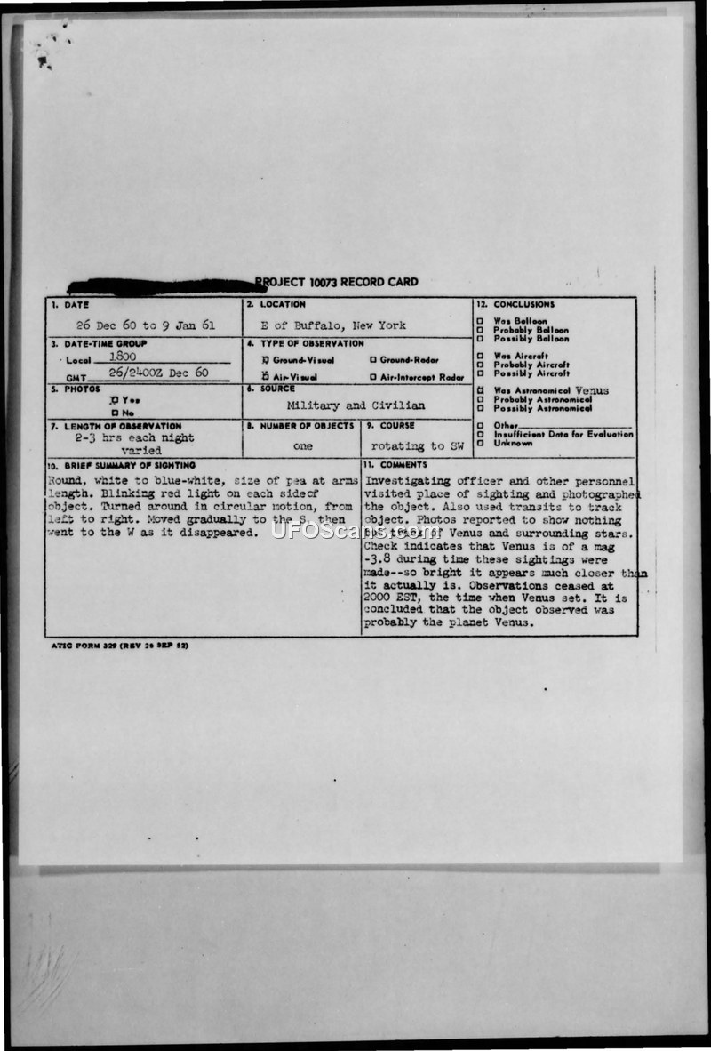A series of UFO sightings near Buffalo, New York, in late 1960 and early 1961 were investigated by the Air Force. The object was officially identified as the planet Venus, with photographic anomalies attributed to camera failure or exposure issues.