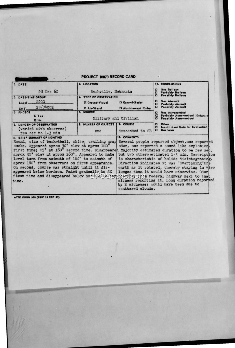 Project 10073 Record Card — Rushville, Nebraska, 29 Dec 60