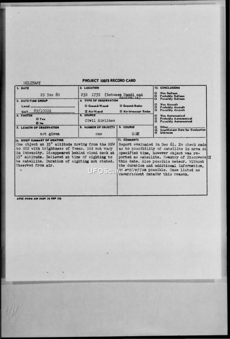 Project 10073 Record Card: Sighting Report 29 Dec 60