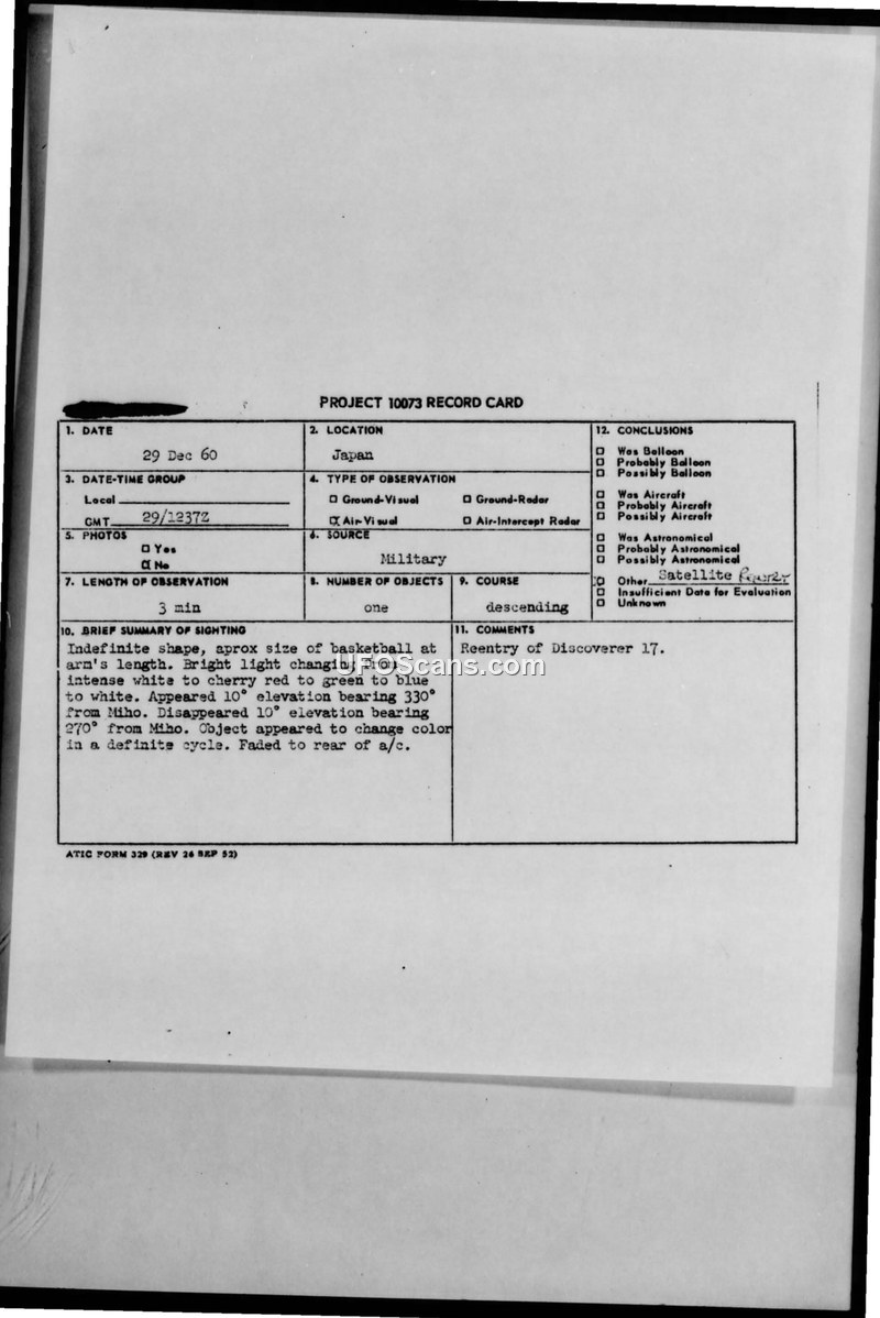 A military sighting report from December 1960 describes an unidentified object over Japan that was later officially identified as the reentry of the Discoverer 17 satellite.