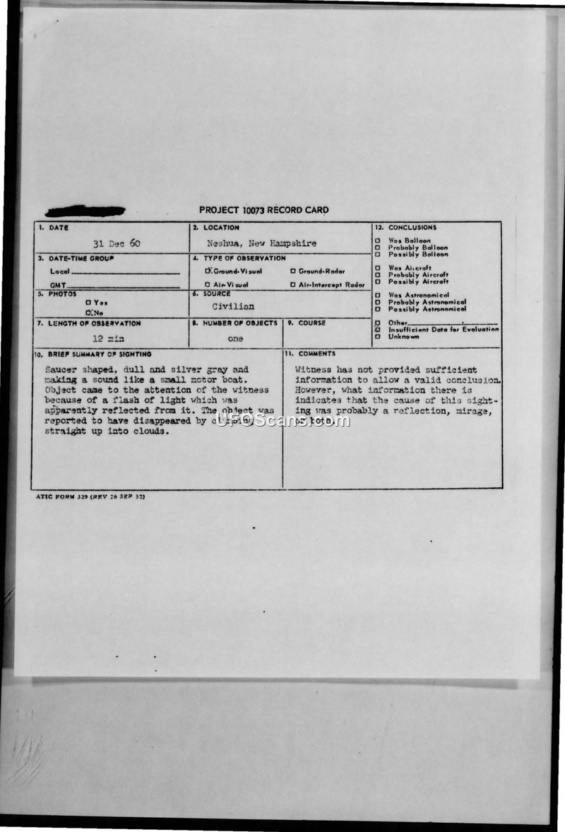 Project 10073 Record Card — Neshua, New Hampshire, 31 Dec 1960