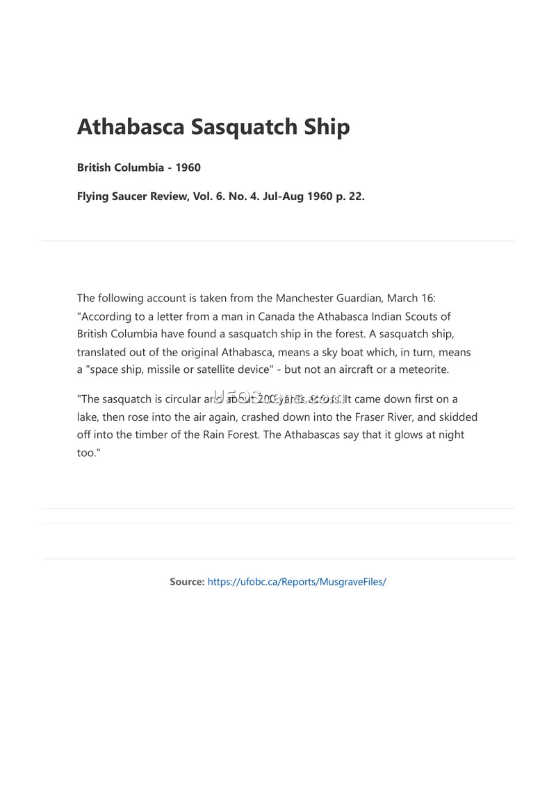 This document, published in the Flying Saucer Review (Vol. 6, No. 4, Jul-Aug 1960), provides an account originally reported by the Manchester Guardian on March 16. The report details a claim that the Athabasca Indian Scouts of British Columbia discovered a 'sasquatch ship' in the forest. According to the text, the term 'sasquatch ship' is derived from the original Athabasca language, translating to 'sky boat,' which is interpreted as a space ship, missile, or satellite device, rather than an aircraft or meteorite. The object is described as circular and approximately 200 yards in diameter. Its reported movement involved landing on a lake, rising into the air, crashing into the Fraser River, and subsequently skidding into the timber of the Rain Forest. Additionally, the Athabasca people reportedly stated that the object glows at night.