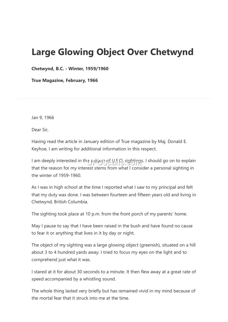 This document is a letter dated January 9, 1966, written by T. Stabberfield to an unspecified recipient, likely in response to an article by Major Donald E. Keyhoe published in the January 1966 edition of True magazine. The author writes to share a personal U.F.O. sighting that occurred during the winter of 1959-1960 in Chetwynd, British Columbia. At the time of the incident, the author was a high school student between fourteen and fifteen years old. The sighting took place at 10 p.m. from the front porch of the author's parents' home. The author describes observing a large, greenish, glowing object situated on a hill approximately 300 to 400 yards away. The object remained in view for 30 seconds to a minute, during which time the author felt as though the object was watching them. The object then departed at a high rate of speed, accompanied by a whistling sound. The author notes that they reported the incident to their school principal at the time. The letter concludes with the author's reflections on the importance of honesty and unity in investigating U.F.O. phenomena, suggesting that societal ridicule may be hindering scientific discovery.