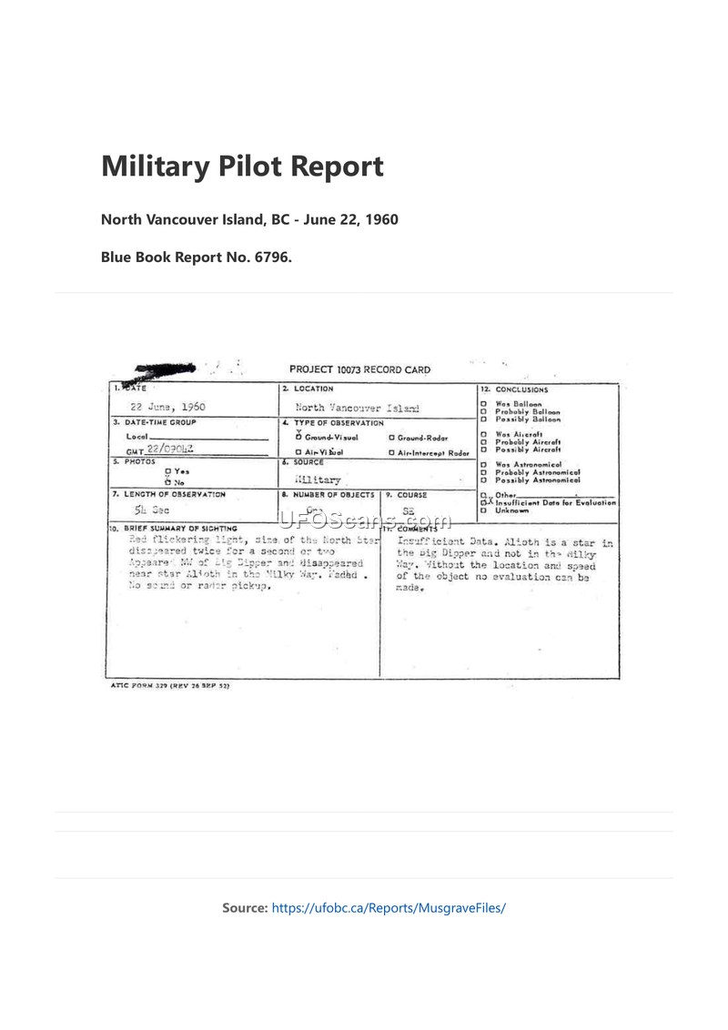 A 1960 sighting report of a flickering light near the star Alioth in the Big Dipper. The investigation concluded there was insufficient data for evaluation.