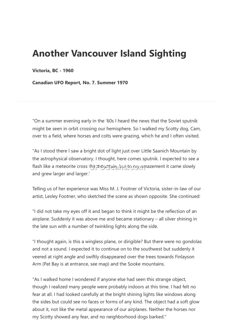 This document, published in the Summer 1970 issue of the Canadian UFO Report, details a sighting that occurred in Victoria, British Columbia, in 1960. The primary witness, Miss M. J. Footner, was walking her dog near Little Saanich Mountain on a summer evening, initially expecting to see the Soviet Sputnik satellite. Instead, she observed a bright dot of light that grew in size and eventually became a stationary, silver, cigar-shaped object hovering above the trees. The object, estimated by the witness to be approximately 100 feet long and 25-30 feet in circumference, featured twinkling lights along its side and emitted a soft glow. It made no sound and, after remaining stationary, performed a right-angle turn before disappearing toward Finlayson Arm and the Sooke mountains. Miss Footner reported feeling no fear during the encounter, and noted that local animals, including her dog and nearby horses, showed no signs of distress. The report also mentions that a friend of the witness, Miss Audrey Winderburn, had observed a similar craft while attending to her horse in the same vicinity.