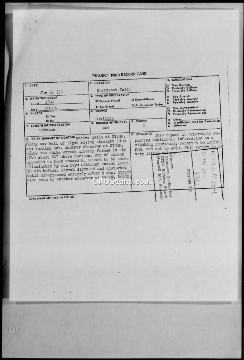 Project 10073 Record Card: Sighting in Northeast India, January 1961
