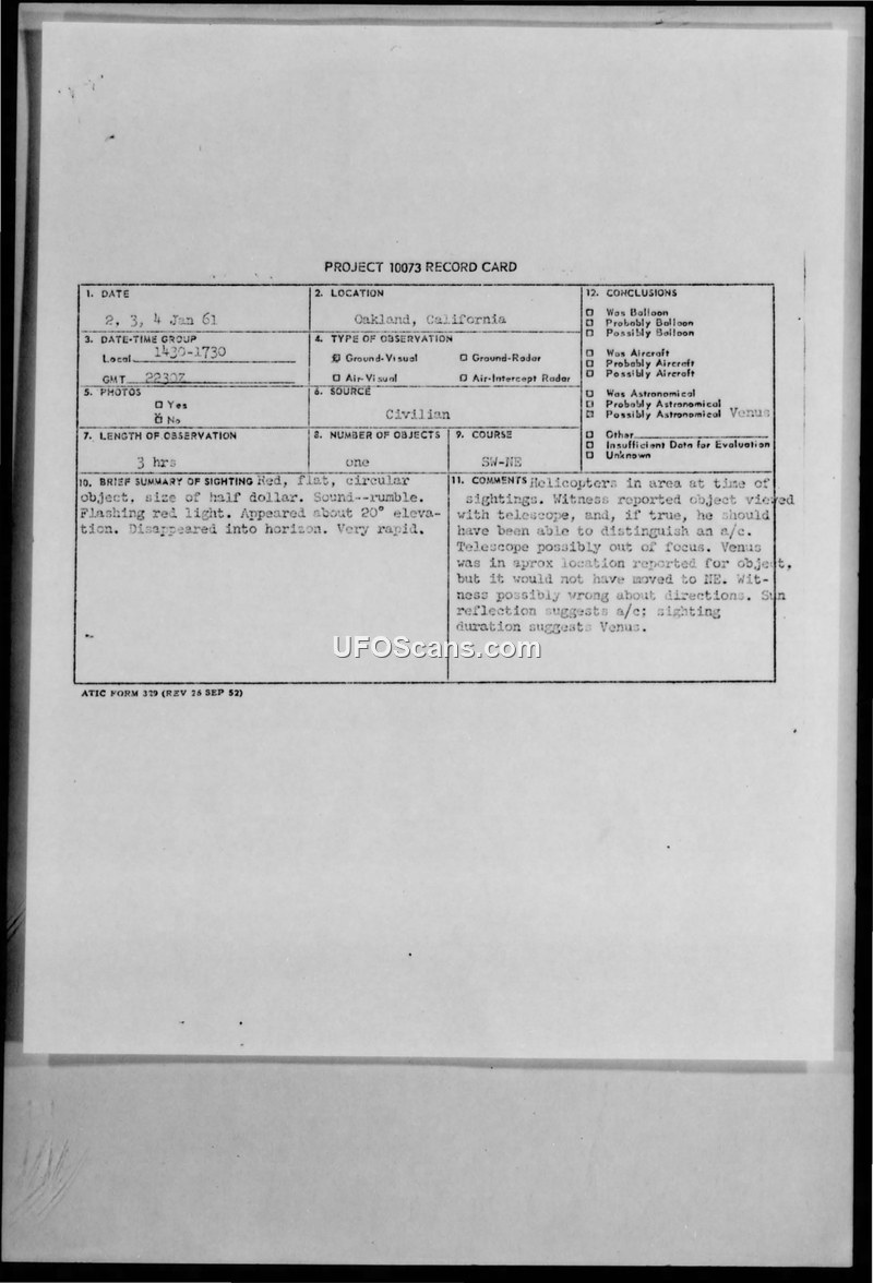 This document consists of a Project 10073 record card and a series of military teletype messages regarding a UFO sighting in Oakland, California, occurring between January 2 and January 4, 1961. A civilian witness reported observing a flat, circular, red object, approximately the size of a half-dollar, over the course of three consecutive nights. The object was described as having a flashing red light, emitting a rumbling sound, and moving in a rapid, non-hovering manner from southwest to northeast at an elevation of approximately 20 degrees. The witness claimed to have used a telescope to observe the object. Military personnel from the 1902nd AACS at Hamilton Air Force Base initiated an investigation, which was subsequently reviewed by the Air Technical Intelligence Center (ATIC). The military investigation expressed skepticism regarding the report. Comments on the record card suggest that helicopters were in the area at the time of the sightings and that the witness should have been able to identify an aircraft if they were truly using a telescope. Investigators posited that the telescope might have been out of focus, that the witness may have been mistaken about directions, and that the object could have been Venus or a reflection of an aircraft. A Flight Service Operations Officer suggested the possibility of a reflection through haze. The correspondence shows a formal request from ATIC to the 1902nd AACS to re-contact the witness and gather more detailed information in accordance with Air Force Regulation 200-2. Subsequent messages confirm that the 1902nd AACS contacted the Oakland Weather Bureau, who reported seeing the same object, though they identified it as a helicopter. The military concluded that the information provided was limited in nature, precluding a definitive analysis.