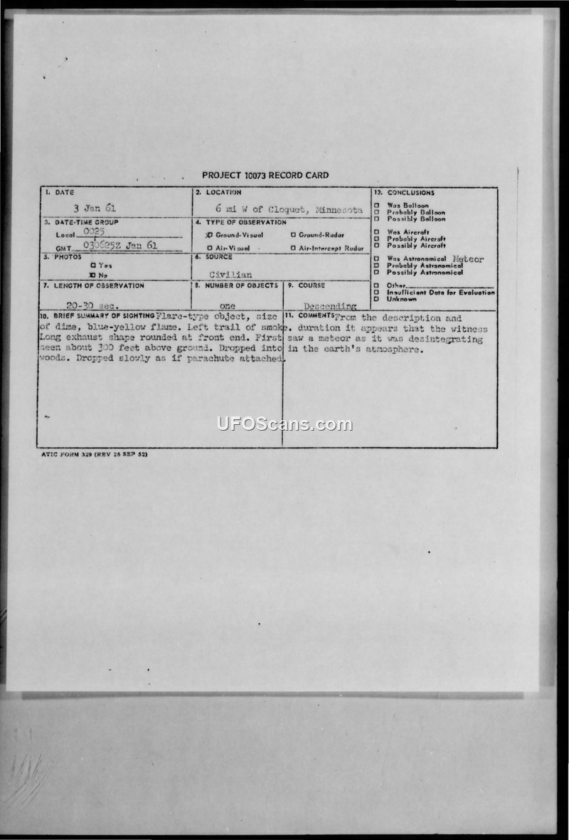 A civilian reported a flare-like object descending and disintegrating near Cloquet, Minnesota, on January 3, 1961. Intelligence officials investigated the report but found the location too imprecise for a physical search.