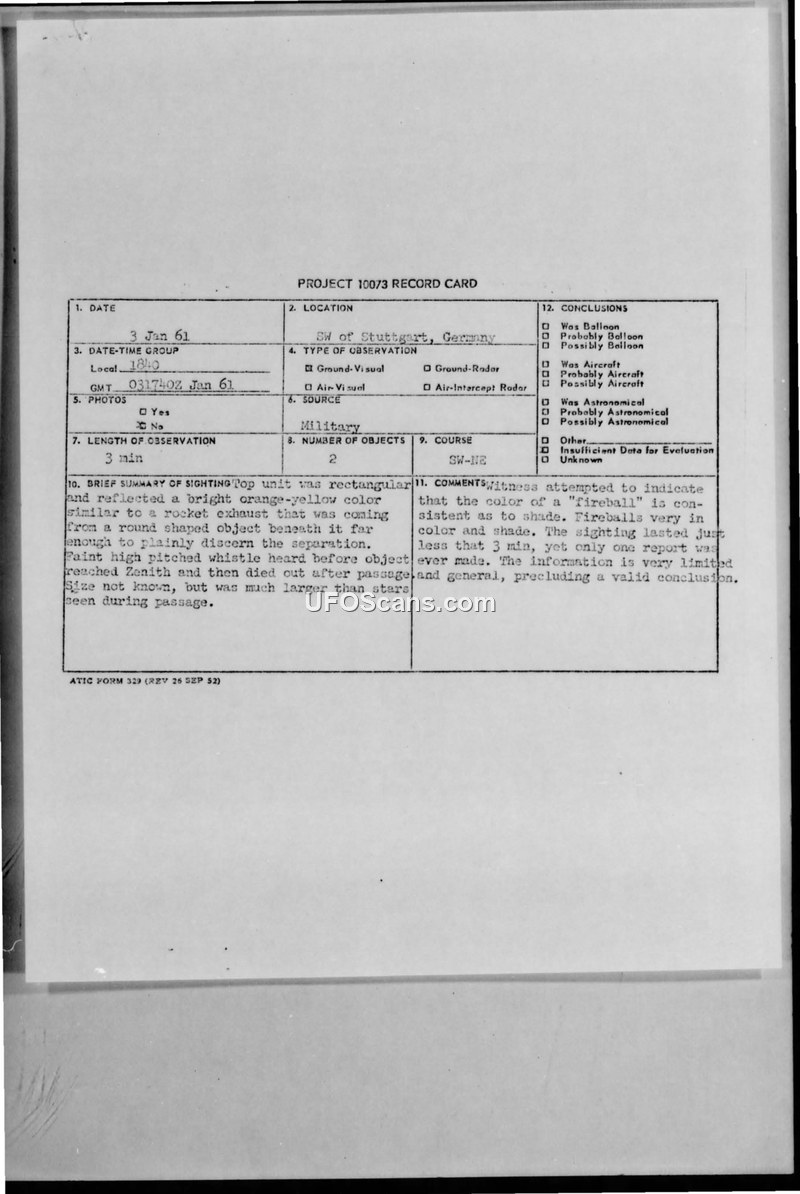 A 1961 UFO sighting report from Stuttgart, Germany, involving a rectangular object that appeared to explode into flaming pieces. The Air Technical Intelligence Center (ATIC) concluded there was insufficient data for a valid evaluation.