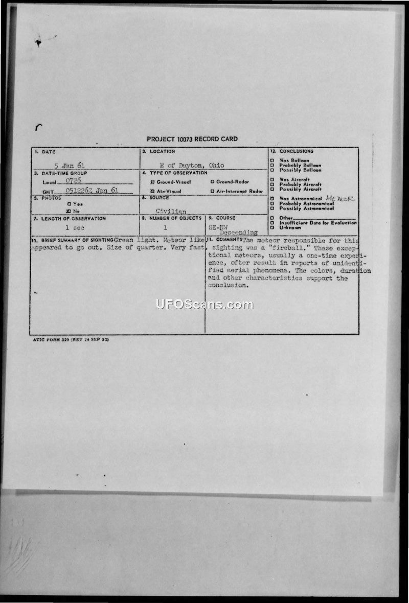 A civilian reported a green, meteor-like object near Dayton, Ohio, on January 5, 1961. The U.S. Air Force concluded the object was a fireball meteor.