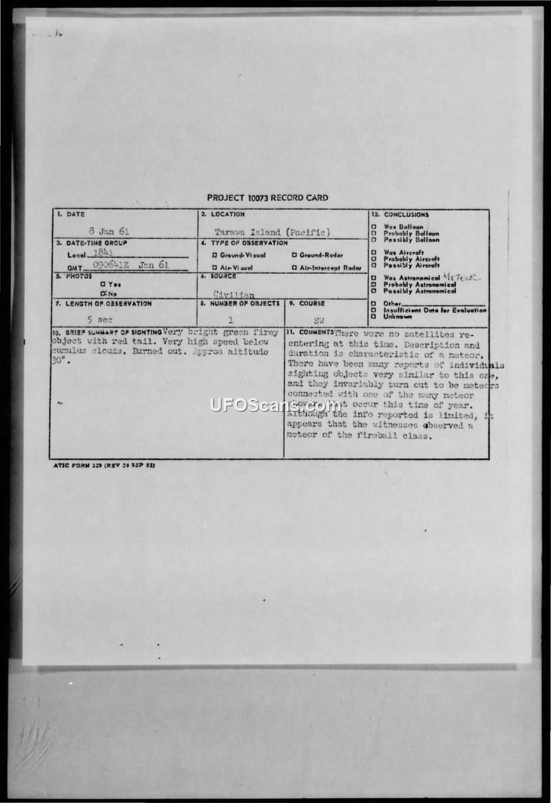 A sighting of a bright green, red-tailed object over Tarawa Island on January 8, 1961, was investigated by the Air Technical Intelligence Center (ATIC). The object was officially identified as a meteor of the fireball class.