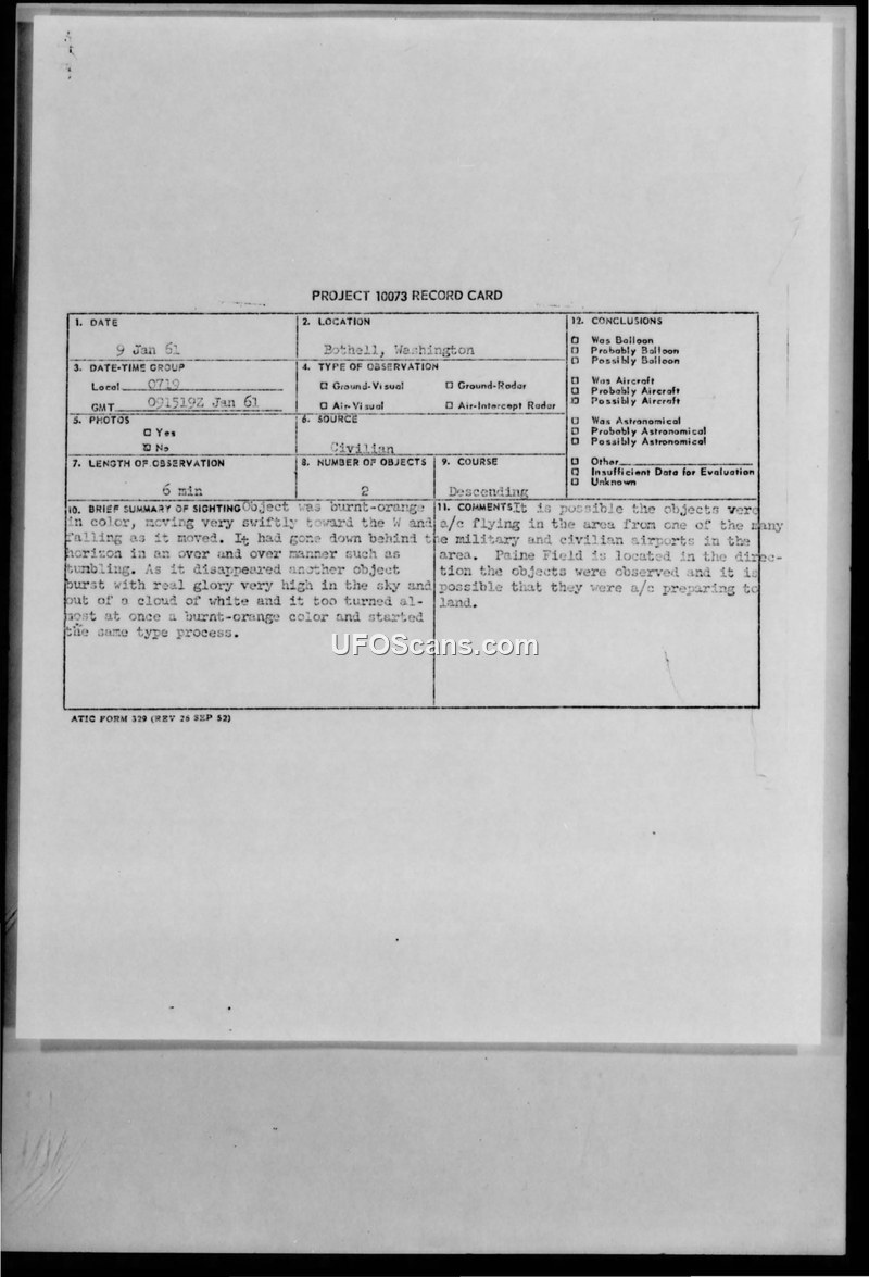 A civilian in Bothell, Washington, reported two burnt-orange, tumbling objects on January 9, 1961. The Air Force determined there was insufficient data to reach a conclusion.