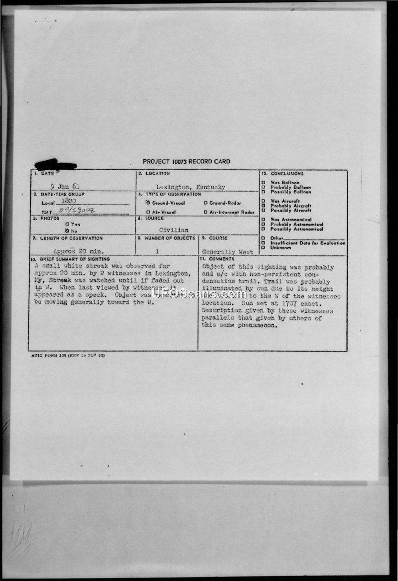 Project 10073 Record Card — Lexington, Kentucky, 9 Jan 61