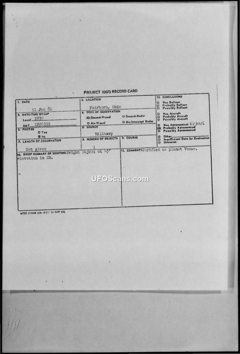 Project 10073 Record Card — Fairborn, Ohio, 11 Jan 61
