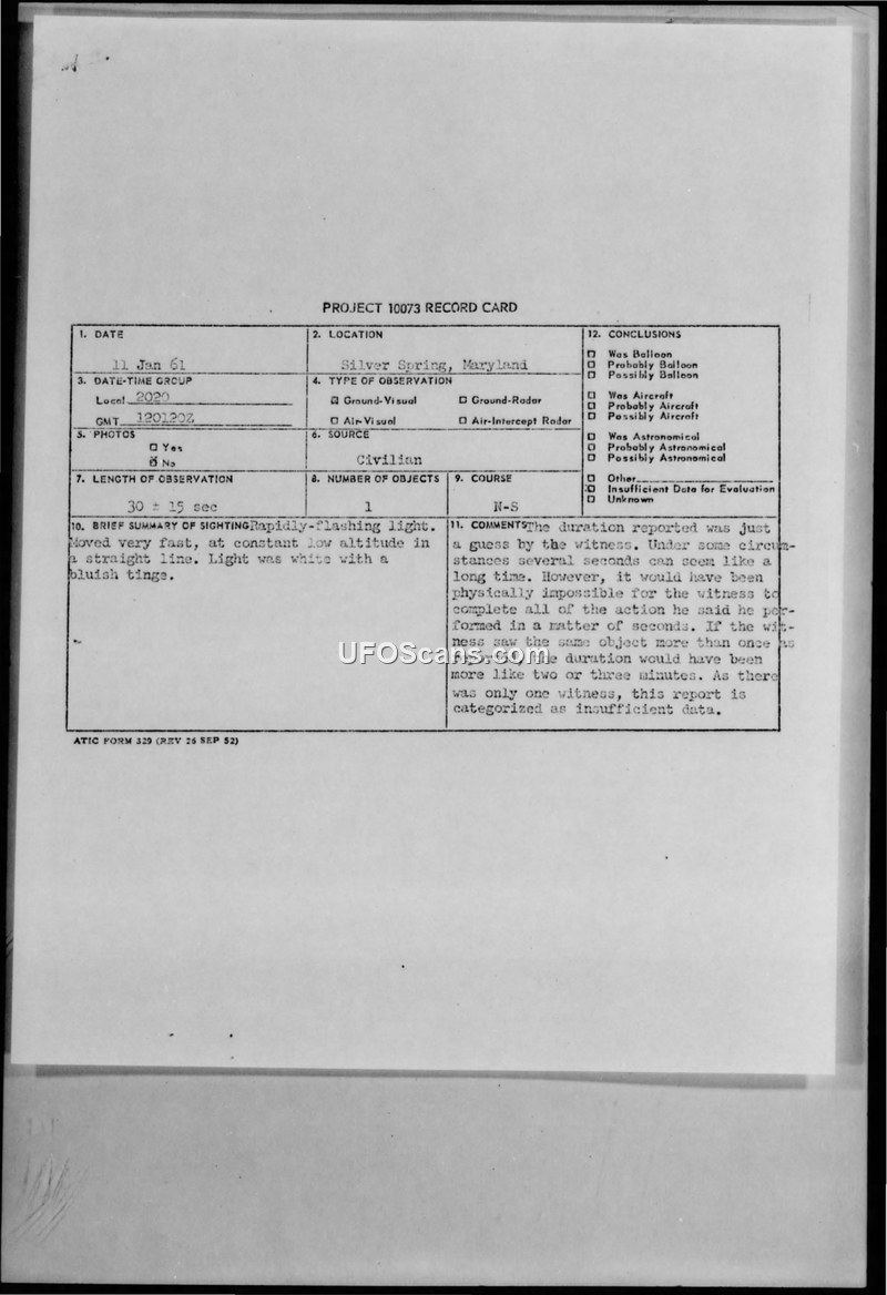 Project 10073 Record Card — Silver Spring, Maryland, 11 January 1961
